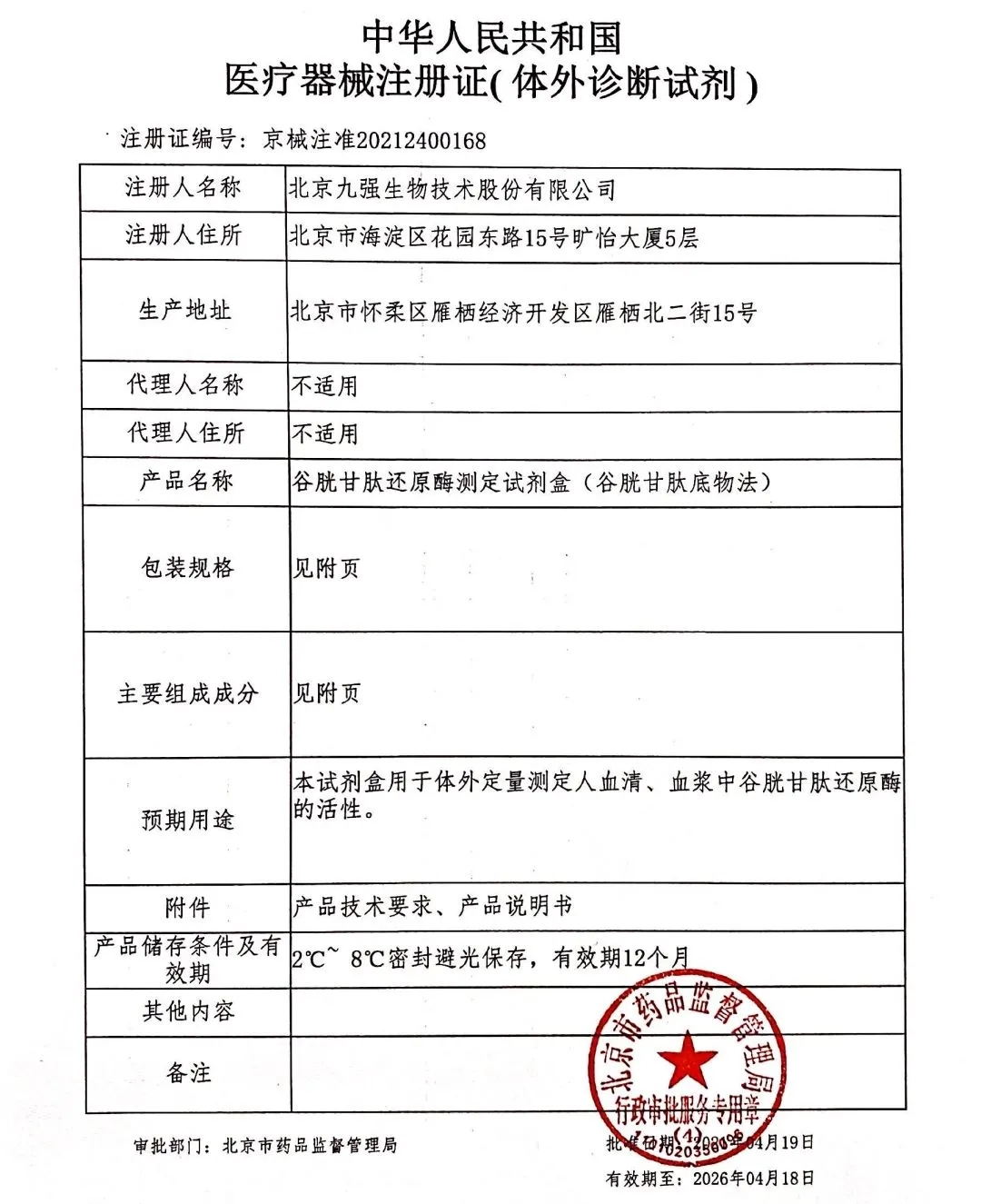 九強(qiáng)生物順利取得北京市藥品監(jiān)督管理局頒發(fā)的三項(xiàng)產(chǎn)品的《醫(yī)療器械注冊(cè)證》:谷胱甘肽還原酶(液體)測(cè)定試劑盒(谷胱甘肽底物法)、脂蛋白相關(guān)磷脂酶A2測(cè)定試劑盒(Lp-PLA2酶法)和胰淀粉酶測(cè)定試劑盒(EPS-G7法)。