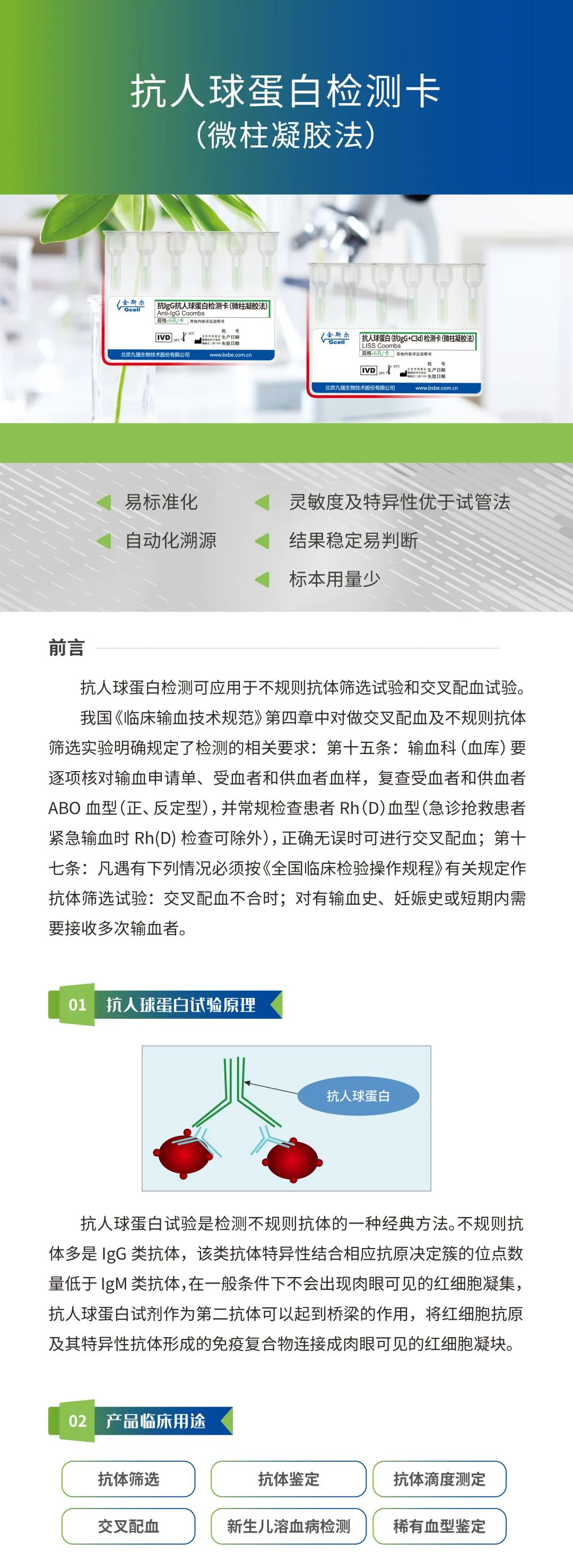 本產品用于間接抗人球蛋白試驗,用于交叉配血,僅用于臨床檢驗,不用于血源篩查。