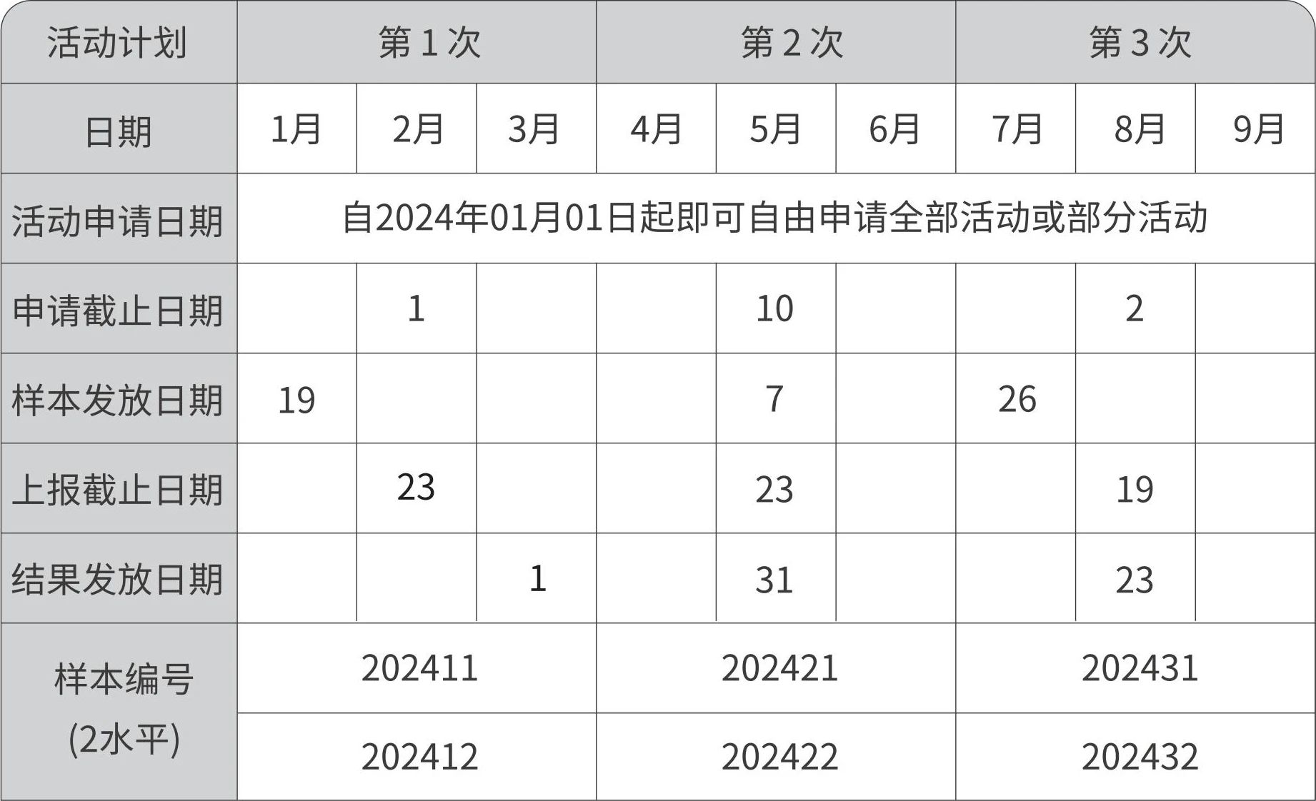 2024年九強生物質(zhì)量評價計劃全年開展3次,每項活動每次發(fā)放2個濃度水平樣本各1支。開展的活動及項目具體如下: