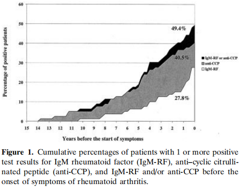 研究表明,Anti-CCP在患者首次RA癥狀出現(xiàn)前的14年前即可在血清中被監(jiān)測到,且具有一定的預(yù)測價值[2]。